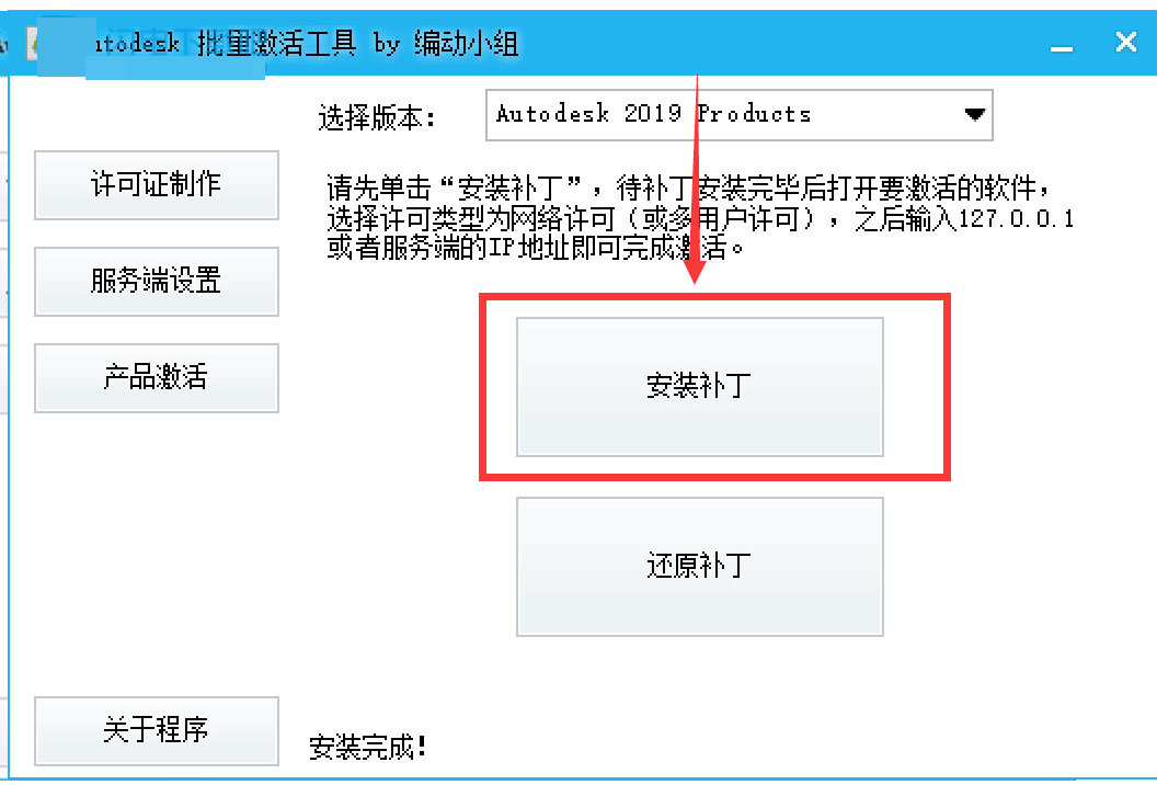13.進入“產品激活”,選擇要安裝補丁的版本,點“安裝補丁”。