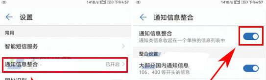 2、接著點擊【通知信息整合】,然后開啟開關(guān)就行了,這樣就能自動整合了。